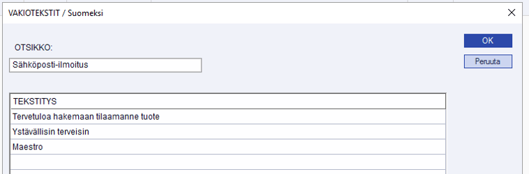 Lähetettäviä vakioviestejä voi lisätä sekä muokata Maestrossa (toimipaikalla) seuraavasta kohdasta: