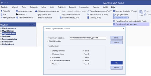 Jos Maestroa käytetään konesalistamme, asiakaspalvelumme voi tarkastella tapahtumalokitiedostoa konesalista käsin, jos loki on määritetty tallennettavaksi.