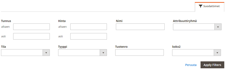 Tuolta takaa aukeaa uusi ikkuna, josta näkee kaikki kaupan tuotteet. Suodattimet - takaa voit asettaa ne vaihtoehdot, jolla haet haluamasi tuotteet ja Apply filters - painike tekee haun.