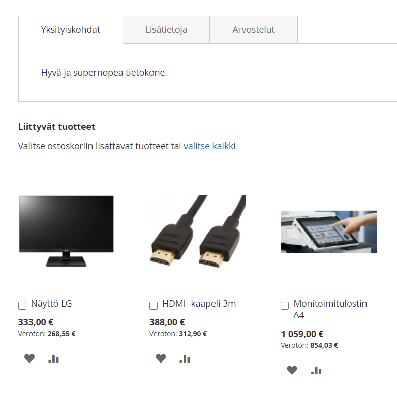 Liittyvät tuotteet saa ostettua jo tuotekortilta täppäämällä halutun tuotteen valituksi tai klikkamalla "valitse kaikki".