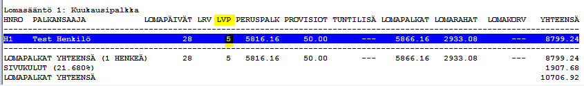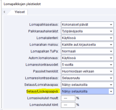 Lomapalkat - yleistiedot: selaus/lisävapaapvä, tässä voidaan määrittää näytetäänkö lomareskontran raporteilla lisävapaapäivät: