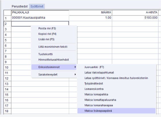 Palkkojen kirjauksessa voidaan lisävapaapäiviä kirjata "maksa lisävapaapäivä" -toiminnolla (hiiren oikea painike - erikoistoiminnot tai vaihtoehtoisesti F8):
