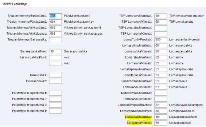 Tiedosto - palkat - yleistiedot - poikkeuspalkkalajeihin määritetään palkkalaji, jolla lisävapaapäiviä kirjataan: