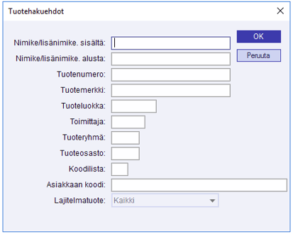 - Haku useampaa hakuehtoa käyttäen - Jos annat Pääryhmätunnuksen tai kysymysmerkin, saat Tuotehakuehdot-ikkunan, jossa voit hakea tuotetta seuraavien kenttien tiedoilla: