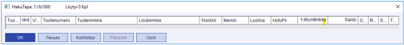 Jos hakuehtoihin sopii useampia tuotteita, ne tulevat hakulistaukseen josta voit valita oikean tuotteen. Hakulistauksessa on tuotteen Pääryhmätunnus ja -koodi, tuotenumero, nimike, yksikkö ja ohjehinta. Jos käytössä varastoseuranta, rivin lopussa näkyy varastosaldo - kaikki varastopaikat yhteensä - tuoterekisterin Yleistietojen määritysten mukaan:
