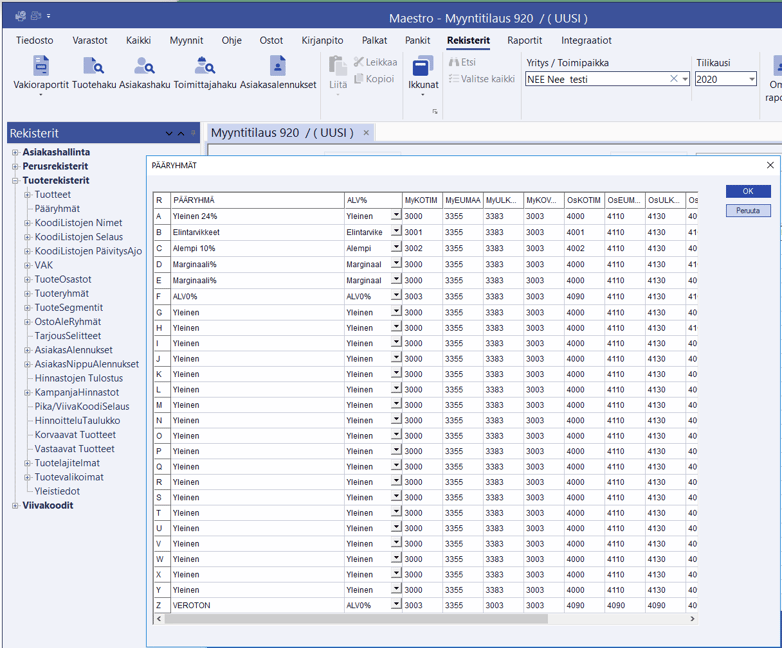 Tuote kuuluu aina johonkin tuoteryhmään, eli pääryhmään. Nämä on määritelty Rekisterit/Tuoterekisteri/Pääryhmät -toiminnossa.