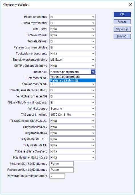 Yrityksen yleistiedoissa Kirjanpito/Ylläpito/Yrityksen yleistiedot puolestaan määritellään, haetaanko tuotteita vain yhdestä pääryhmästä kerrallaan, vai kohdistetaanko haku kaikkiin pääryhmiin. Yleisin valinta on haku yhdestä pääryhmästä kerrallaan.