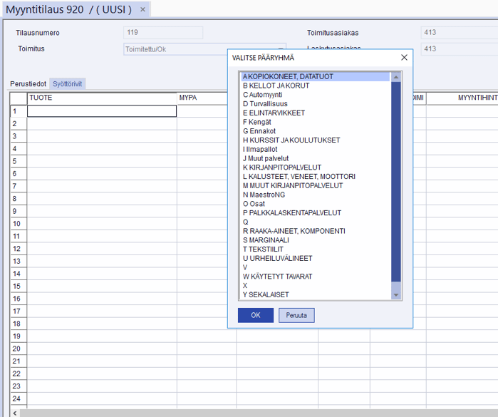 Hae ensin Pääryhmä. Jos et muista ryhmän tunnistetta, paina Enter tai TAB, jolloin Maestro aukaisee Pääryhmän valintaikkunan.