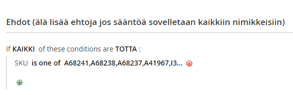 Kun halutaan antaa samalla tuoteluettelon hintasäänöllä alennus useammalle eri tuotteelle sku:n/Maestron tuoteid:n perusteella niin tällöin tulee kyseisen säännön Ehdot - välilehdellä valita "sku is one of.." kuten kuvassa alla.
