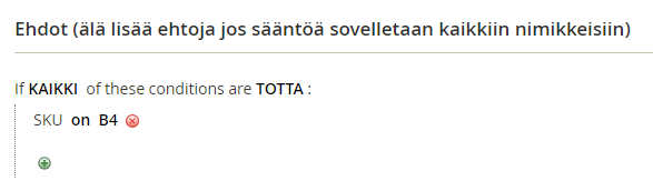 Alennushinta yhdelle tuotteelle verkkokaupassa tuoteluettelon hintasäännöllä Julkaisupäivä 01.03.2021 Tuoteluettelon hintasäännöllä tuotekohtainen alennus yhdelle tuottelle annetaan valitsemalla Ehdot -välilehdellä vaihtoehto "sku on..."