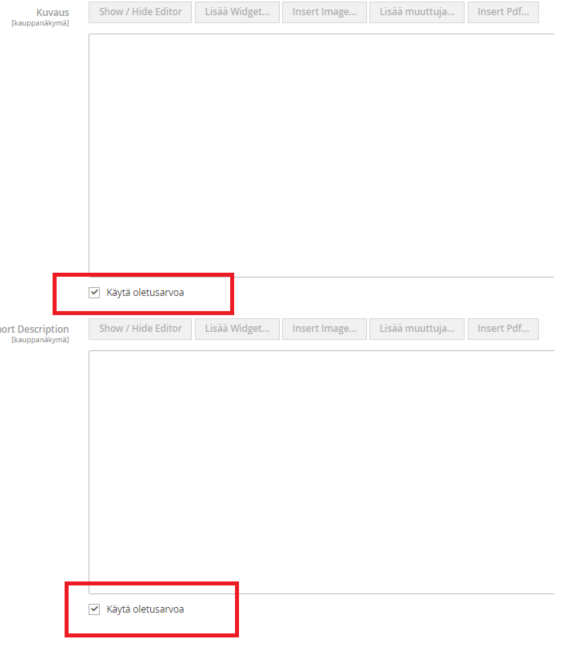 Tarkista sekä lyhyt että pitkä kuvaus - kohdista, että kuvauksen kohdalla on " Käytä oletusarvoa" - täppä laitettu. Mikäli tuo puuttuu niin silloin täpätään "käytä oletusarvoa" ja tallennetaan kyseisessä kauppa näkymässä niin teksti päivittyy verkkokauppaan.