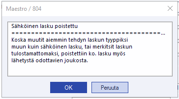 Jos laskua uudelleen tulostettaessa paperille ei tule oheista viestiä "Sähköinen lasku poistettu" ja Maestroa käytetään konesalista käsin Maestron asiakaspalvelu voi auttaa peruuttamaan laskun.