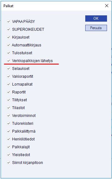 Tiedosto > Käyttöoikeudet > Käyttöoikeuksien määritykset > Valitse käyttäjä > Käyttöoikeudet > Palkat > Verkkopalkkojen lähetys :