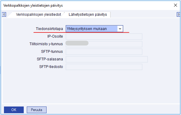 - Huom! Jos asiakasyrityksessä palkkoja laskee käyttäjä, jolla ei ole käyttöoikeutta tilitoimistoympäristön yhteysyritykseen, ei verkkopalkkojen lähetys onnistu ao. määrityksen mukaan. Tällöin tiedonsiirtotavaksi pitää asiakasyrityksessä valita SFTP (konesali).