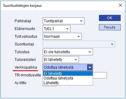Palkkalaskelmien taakse, suoritustietojen korjaukseen on lisätty Verkkopalkka -valinta. Alasvetovalikosta löytyvät Ei lähetetty, Odottaa lähetystä ja Lähetetty -tilat.