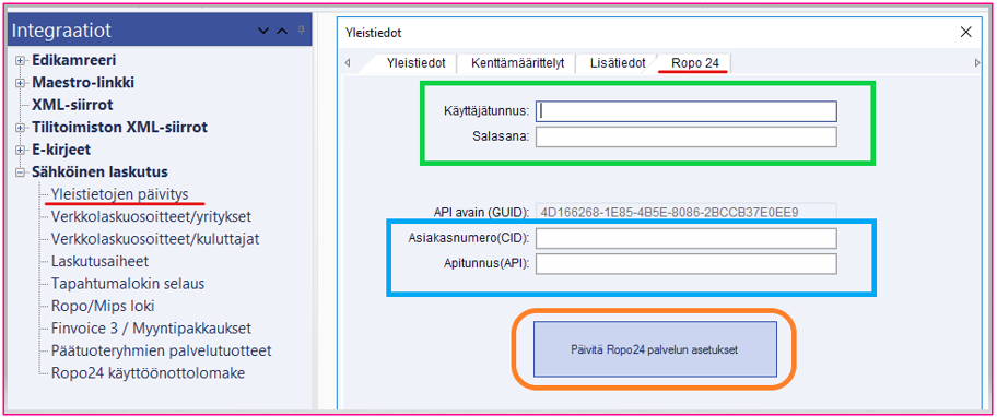 - Integraatiot > Sähköinen laskutus > Yleistietojen päivitys > Ropo 24