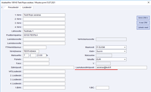 - Sähköpostilaskutuksessa käytetään asiakaskortin kenttää ’Laskutussähköposti’