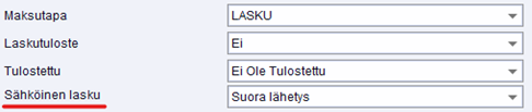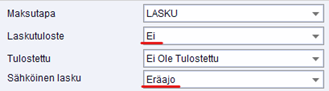 - Sähköinen lasku kenttä arvolla ’Suora lähetys’ tai ’Eräajo’ ja Laskutuloste ’Ei’.