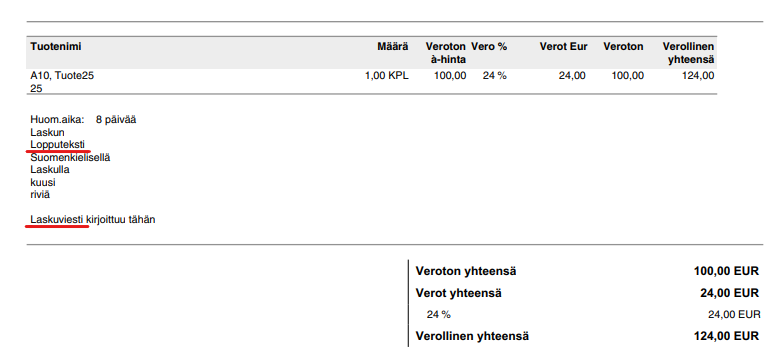 - LaskuViestit tai Laskujen LoppuTekstit: Tänne kirjattu teksti näkyy laskulla tuoterivien jälkeen ennen yhteensä summia
