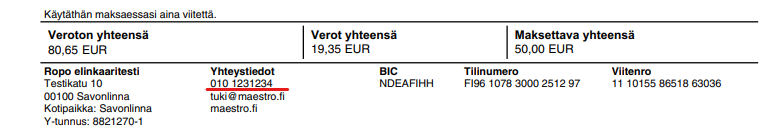 - Puhelin: Tähän kirjattu numero näkyy laskun lopussa Yhteystiedot otsikon alla