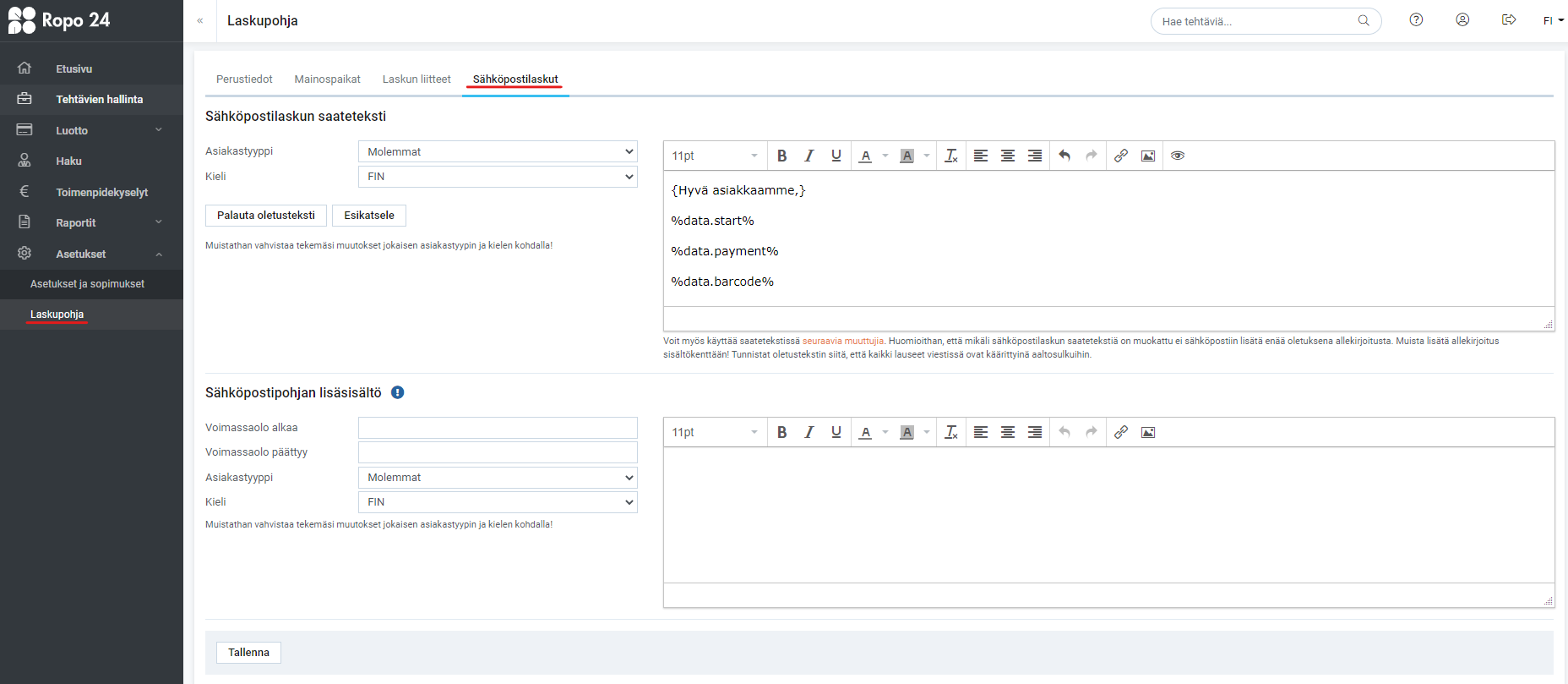 - Ropo24.fi / Asetukset / Laskupohja / Sähköpostilaskut