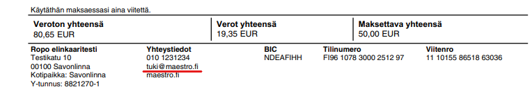 - Yhteydenottotiedot voidaan myös kirjata itse laskulle. Tiedot laskulle määritetään Maestrossa