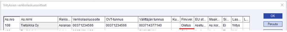 - Tarkistettava verkkolaskuosoitteistosta, että kaikilla asiakkailla on käytössä Finvoicen versio Oletus tai 3.0. Sähköinen laskutus – Verkkolaskuosoitteet/Yritykset – Päivitys F2 – Finvoicen versio