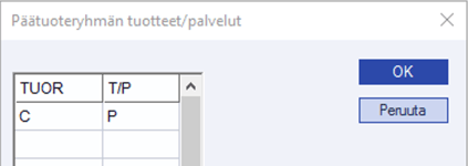 esim. näin TUOR = C , T/P = P (kyseessä C päätuoteryhmä ja palvelu alv 0%)