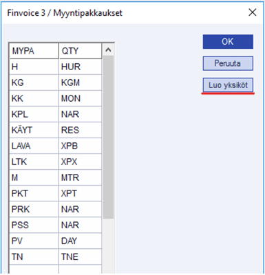 - Päivitä yleisimmät myyntipakkaukset ohjelmaan ensimmäisellä käyttökerralla painamalla ’Luo yksiköt’ painiketta. Painike jää aktiiviseksi ja listan voi myöhemminkin päivittää. Jos listalle on lisätty muita käytössä olevia myyntipakkauksia, korvaa painikkeen painaminen muut kirjaukset. Listalle voi lisätä myyntipakkauksia ja poistaa niitä F3 painikkeella.
