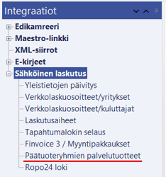- Tässä valikossa määritetään sähköiselle sanomalle vietävä koodi alv 0% palvelutuotteille.