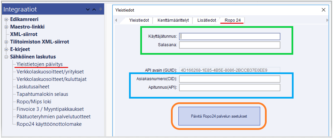 Maestrolta saadut käyttäjätunnus ja salasana ja Ropolta saadut Api avaimet ja kirjataan Sähköisen laskutuksen yleistietojen Ropo 24 välilehdelle.