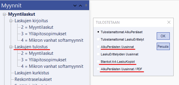 Sen jälkeen paperituloste otetaan Laskujen tulostus -valikon kautta kohdasta Blankot A4 -LaskuKopiot tai Alkuperäisten uusinnat PDF. Voidaan käyttää myös tulostustapaa Alkuperäisten Uusinnat - Sähköiset laskut paperille - laskunumerorajaus.