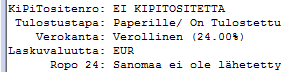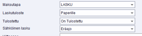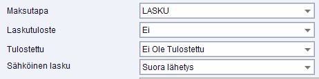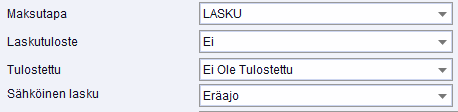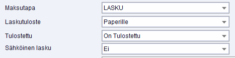 Jos käytössä on Ropo24 palvelu, katsotaan laskun tulostus määritys myös Sähköinen lasku kentän mukaan. Jos laskua ei ole lähetetty Ropolle onnistuneesti, katsotaan lasku tulostamattomaksi.