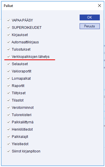 Tiedosto > Käyttöoikeudet > Käyttöoikeuksien määritykset > Valitse käyttäjä > Käyttöoikeudet > Palkat > Verkkopalkkojen lähetys :