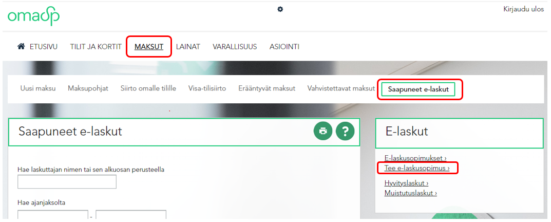Esimerkki OmaSp pankin E-laskusopimuksen tekemisestä:
