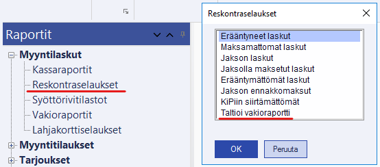 Vakioraportti tallennetaan edellisestä ajetusta selauksesta, eli ensin on ladattava ruudulle halutuilla rajauksilla haettu selaus esim. Myynnit/Myyntilaskut/Reskontraselaukset/Jakson laskut. Tämän jälkeen jätä selaus auki ja avaa uudelleen valikko ja sieltä Myynnit/Myyntilaskut/Reskontraselaukset/Taltioi vakioraportti.