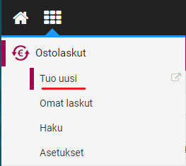Uuden ostolaskun tuominen on mahdollista avata joko Ostolasku-sovelluksen valikosta (kohdasta Tuo uusi), Sähköisen työpöydän kautta tai voit asettaa ostolaskun tuomisen myös mobiililaitteesi kotivalikkoon.