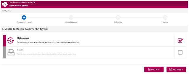 1. Valitse tuotava dokumentin tyyppi (ostolasku tai kuitti)