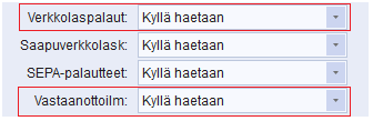 - Määritetään kohdassa Pankit / Pankkiliikenne / Rekisterit / Pankkitiedot / Pankkiyhteystiedot / Verkkolaspalaut: ja Vastaanottoilm: