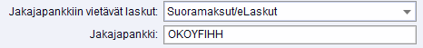 Jos teillä on sähköisessä laskutuksessa välittäjänä Ropo One, sähköisen laskutuksen yleistiedoissa pitää määritellä ainakin Jakajapankkiin vietävät laskut (Suoramaksut/eLaskut) ja Jakajapankki. Jakajapankki kenttään kirjataan sen pankin BIC-tunnus, jonka kanssa tehty erillinen jakajapankkisopimus.