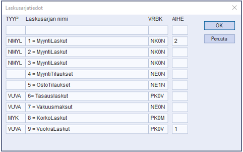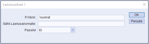 Laskutusaihe on selväkielinen tieto, joka tulee näkymään myös asiakkaanne verkkopankissa, esimerkiksi Vuokra. Tarvittaessa laskutusaiheita voi olla useampi käytössä, mutta on mahdollista käyttää myös yleisnimitystä (esim. Yritys Oy:n laskut). Laskutusaiheita voi olla laskusarjoja vastaava määrä. Jos Maestron eri myyntilaskusarjoilla on omat laskutusaiheensa, asiakkaanne voi valita, haluaako hän ottaa kaikkien eri laskusarjojen laskut vastaan e-laskuina tai suoramaksuina, vai ottaako hän vain jonkun laskusarjan laskuja vastaan e-laskuina tai suoramaksuina. Jos asiakas vastaanottaa useamman laskutusaiheen mukaisia laskuja vastaan, Maestroon tulee jokaista laskutusaihetta varten oma rivinsä (esim. vuokralaskut, tasauslaskut, normaalit myyntilaskut), eli maksimissaan laskusarjojen verran.