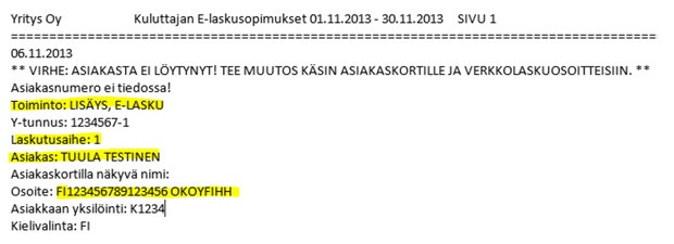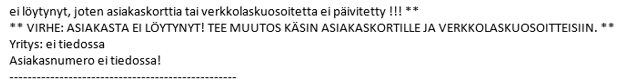 - Jos pankista tulevassa sanomassa on esimerkiksi asiakasnumero väärin, ohjelma ei löydä asiakasta ja tieto asiakkaan tilaamasta maksutavasta ei päivity asiakaskortille automaattisesti. Tällöin tulee virhe Tiedonsiirtoraportille: