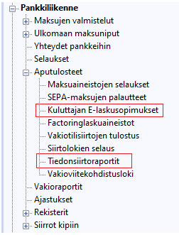 Pankista tulleita vastaanottoilmoituksia voi selata aputulosteista kohdassa Pankit / Pankkiliikenne / Aputulosteet / Kuluttajan E-laskusopimukset ja Tiedonsiirtoraportit.