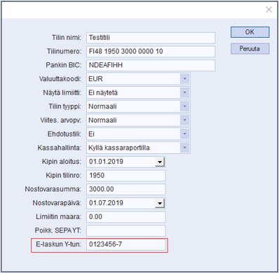- Määritetään kohdassa Pankit / Pankkiliikenne / Rekisterit / Pankkitilitiedot / E-Laskun Y-tun: