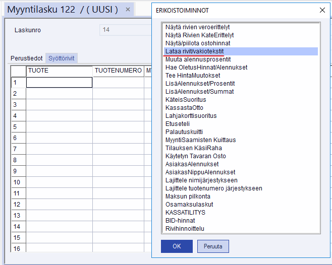 Siirry syöttöriveille ja paina F8 tai hae hiiren oikean takaa Erikoistoiminnot > Lataa rivit/vakiotekstit