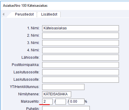 Lasku maksutapaan päättäminen edellyttää Maksuehdon määrittämistä asiakaskortille (min 2 pvä):