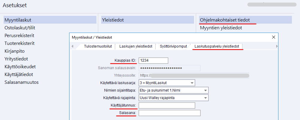 Käyttöönotto määritellään Myyntalaskut / Yleistiedot / Ohjelmakohtaiset tiedost / Laskutuspalvelu yleistiedot-välilehdellä.