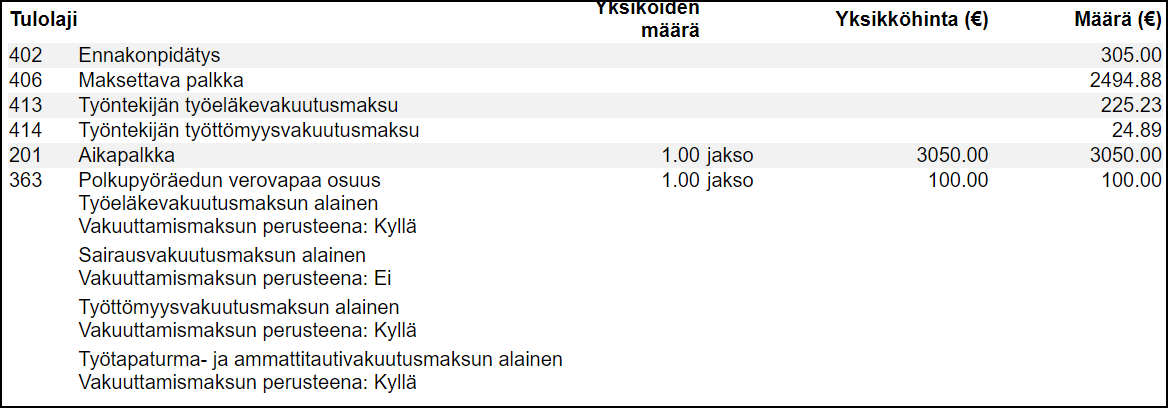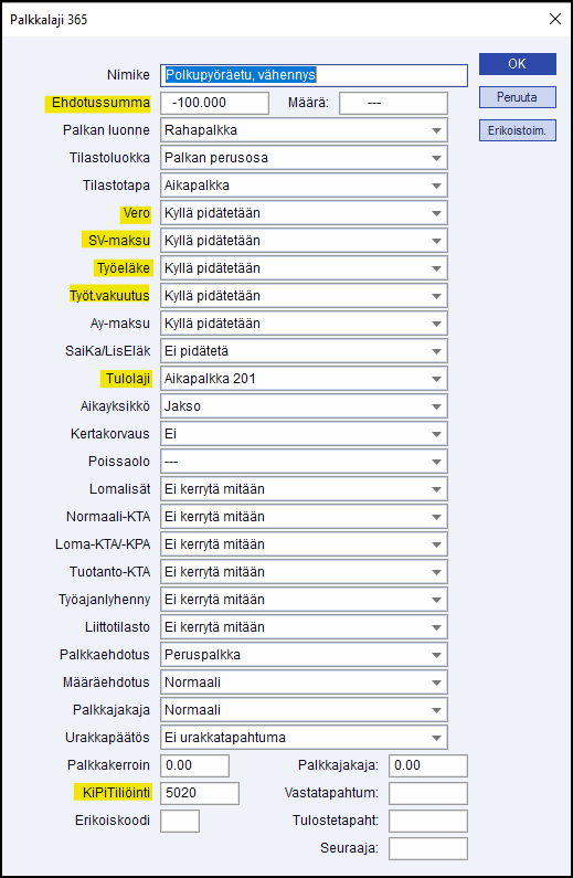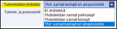 Polkupyöräetu ilmoitetaan tulolajilla 363 ja rahapalkan vähennys tehdään samalla tulolajilla, jolla tuntipalkka maksetaan. Tuntipalkkaisella vähennystä ei voi suoraan tehdä maksuun menevästä tuntipalkkarivistä, vaan vähennys pitää tehdä omalla rivillään. Kun Tiedosto > Palkat > Yleistiedot > Yleiset yleistiedot -ikkunassa on valittuna yhdistä samat tulolajit, onnistuu tulolajien yhdistäminen palkkatietoilmoitukselle. Jos vähentävällä palkkalajilla on eri aikayksikkö kuin maksavalla, niin tulorekisteriyhdistely toimii, kun valitaan Yhd. samat tulolajit eri aikayksiköllä.
