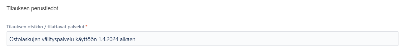 Täydennä tilauksen tiedot. Otsikkoon voit laittaa päivämäärän, josta alkaen palvelu täytyy olla käytössä. Oletuksena ostolaskujen kappaleveloitukset veloitetaan tilitoimistolta. Jos kulut halutaan veloittaa suoraan loppuasiakkailta, tästä mainitaan tilauksen lisätiedoissa. *