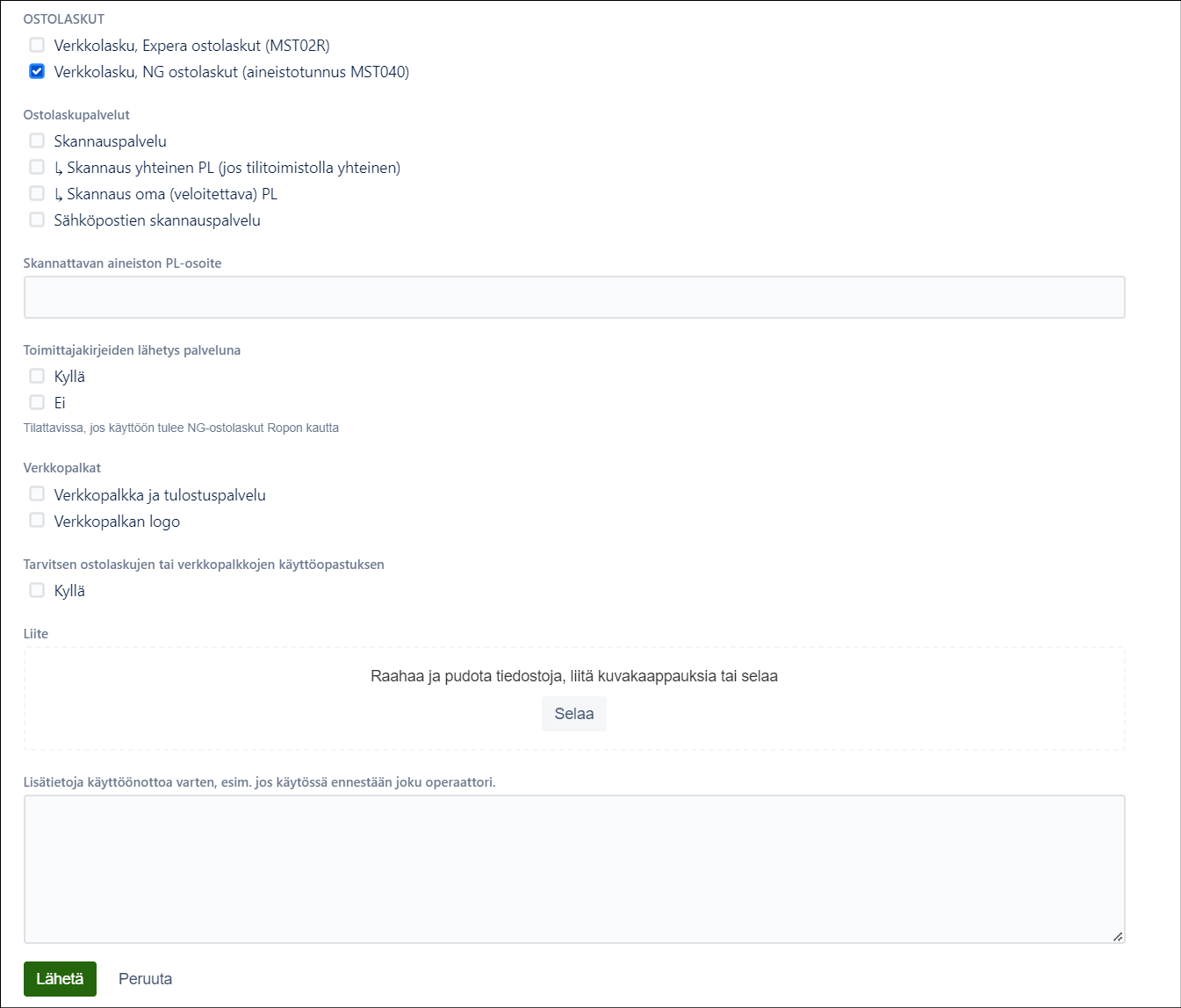 Tilaukselle valitaan Verkkolasku, NG Ostolaskut tilattavaksi. Lisäksi on mahdollista tilata samalla käyttöön skannauspalvelu, jonka hinnat löytyvät sanomanvälityshinnastostamme. Tilitoimistolle voidaan avata yksi yhteinen postilokero skannauspalvelua varten – asiakas tunnistetaan laskulta verkkolaskuosoitteen perusteella. Jos tilitoimistolle itselleen ei tule NG:n ostolaskuja ja skannauspalvelua käyttöön, tästä mainitaan tilauksen lisätiedoissa.